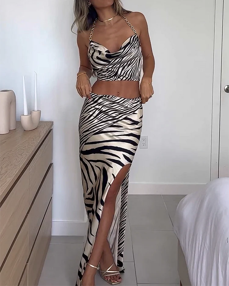 Conjunto de Duas Peças com Estampa de Zebra e Saia Superior com Corrente Halter. Este conjunto é a escolha perfeita para quem procura uma combinação única que une moda contemporânea e estampa animal elegante.