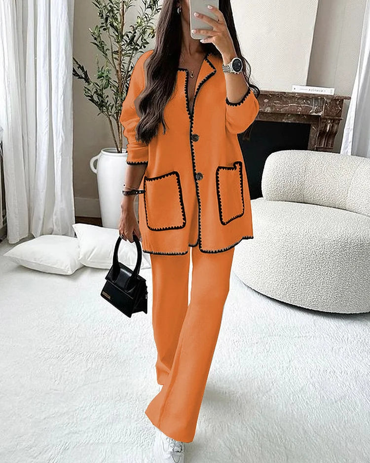 Conjunto de Duas Peças com Top de Malha Decorado com Linha de Cor Sólida e Calças Casuais, uma escolha elegante para quem busca estilo e conforto em uma única proposta. Este conjunto é perfeito para adicionar um toque de sofisticação casual ao seu guarda-roupa.