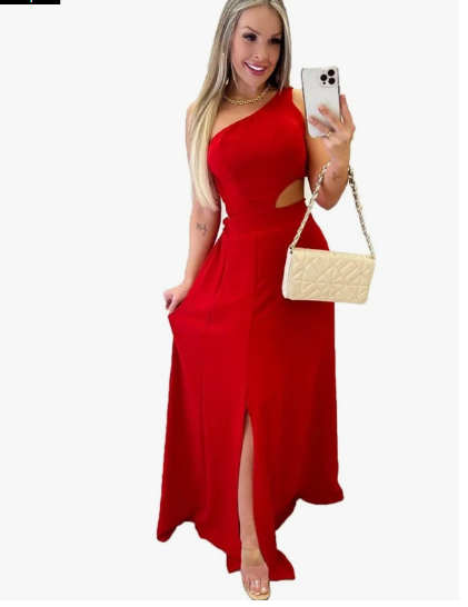O toque ousado do ombro só adiciona um charme sutil, enquanto a fenda lateral confere um toque de sensualidade e movimento à sua aparência.