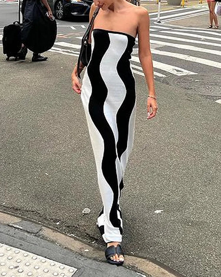 Desperte a sua ousadia com o nosso deslumbrante Vestido Sem Alças, uma verdadeira obra de arte em bloco colorido com linhas onduladas. Este vestido é a expressão máxima de elegância e estilo contemporâneo, perfeito para ocasiões especiais que exigem um toque de originalidade.